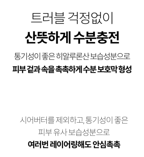 통기성이 좋은 히알루론산 보습성분으로 피부 겉과 속을 촉촉하게 수분 보호막을 형성해줘요. 시어버터를 제외하고, 통기성이 좋은 피부 유사 보습성분으로 여러번 레이어링해도 안심하고 사용할 수 있어요.