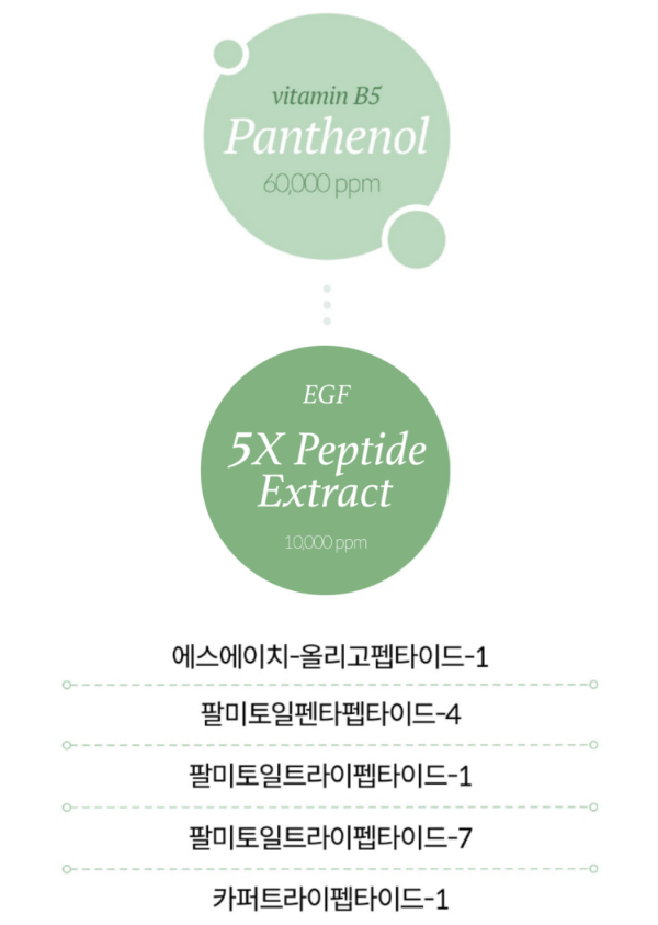 판테놀 60,000ppm과 에스에이치-올리고펩타이드-1, 팔미토일펜타펩타이드-4, 팔미도일트라이펩타이드-1, 팔미토일트라이펩타이드-7, 카퍼트라이펩타이드-1 5가지 펩타이드가 10,000ppm 함유되어있어요.