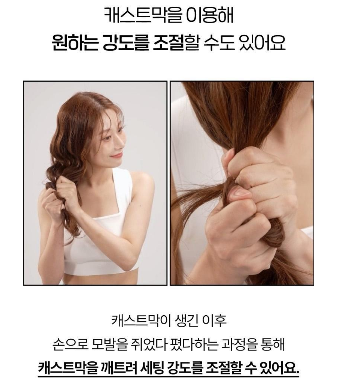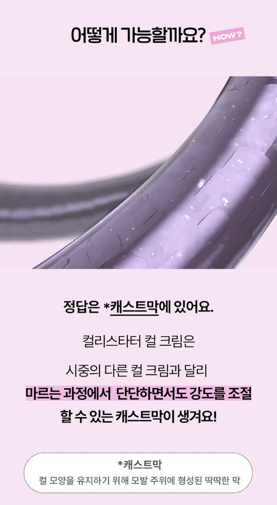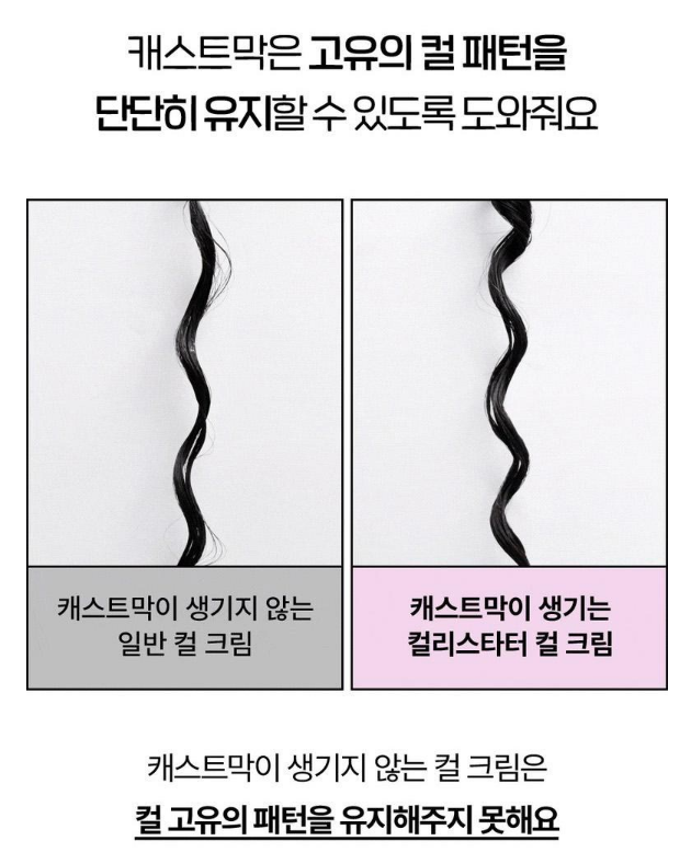 이는 캐스트막을 통해서 이루어지는데요. 컬리스타터 컬크림은 시중의 다른 컬크림고 달리 마르는 과정에서 단단하면서도 강도를 조절할 수 있는 캐스트막이 생겨요.