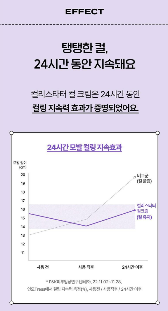 컬리스타터 컬 크림은 24시간 동안 컬링 지속력 효과가 증명되었어요.