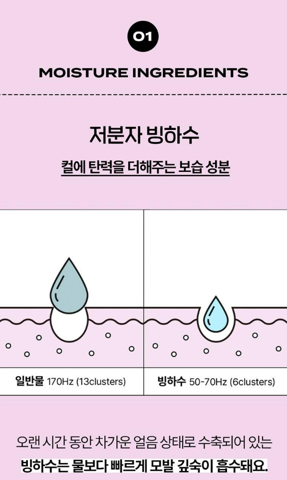 오랜 시간 동안 차가운 얼음 상태로 수축되어 있는 빙하수는 물보다 빠르게 모발 깊숙히 흡수돼요.