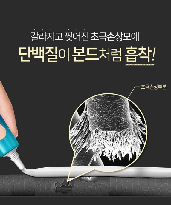 갈라지고 찢어진 초극손상모에 단백질이 본드처럼 흡착돼요.