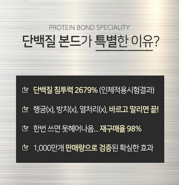 헤어플러스 단백질 본드는 단백질 침투력이 매우 높고, 노워시 제품이에요. 또한 높은 재구매율과 판매량으로 확실한 효과를 입증했어요.