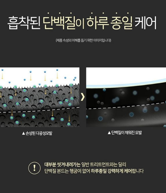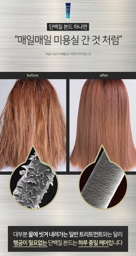 대부분 씻겨내려가는 일반 트리트먼트와는 달리 단백질 본드는 헹굼이 없어 하루종일 강력하게 케어준답니다.