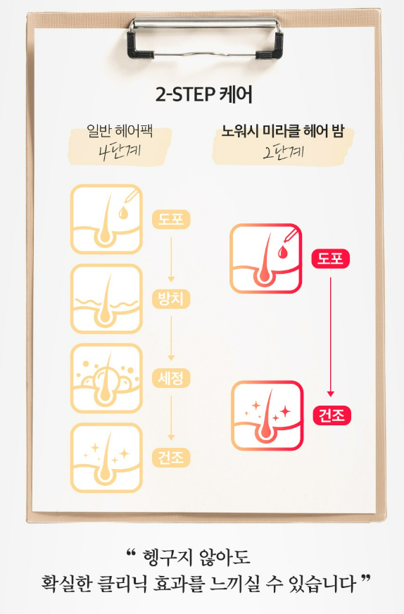 바쁜 아침 번거로워서 포기해야만 했던 헤어 관리 이제 노워시 미라클 헤어 밤으로 빠르고 편하게 관리할 수 있어요.