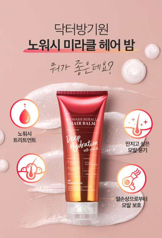 닥터방기원 노워시 미라클 헤어 밤은 노워시, 모발 윤기, 열손상으로부터 모발 보호가 가장 큰 특징이에요.