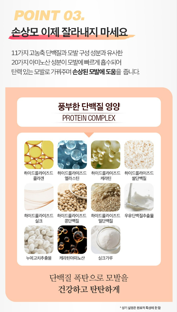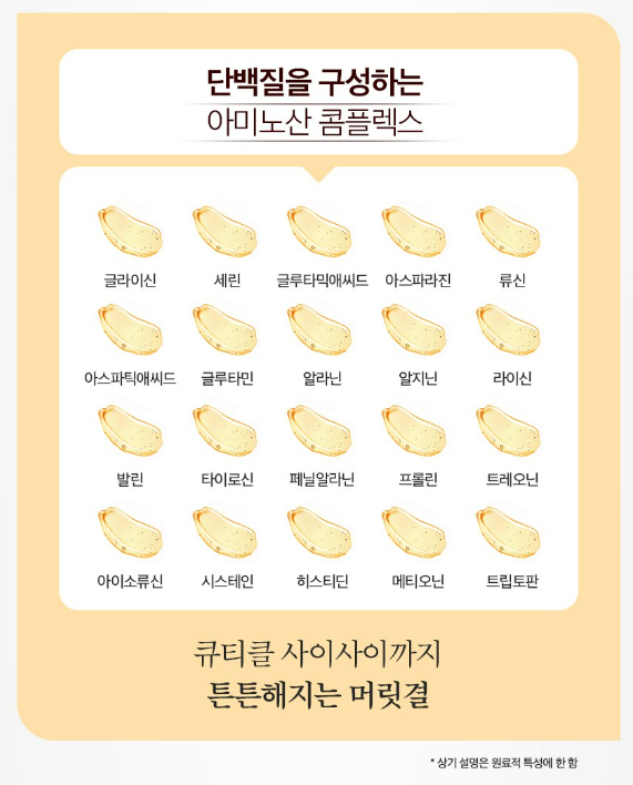 11가지 고농추 단백질과 모발 구성 성분과 유사한 20가지 아미노산 성분이 모발에 빠르게 흡수되어 탄력 있는 모발로 가꿔주며 손상된 모발에 도움을 줘요.