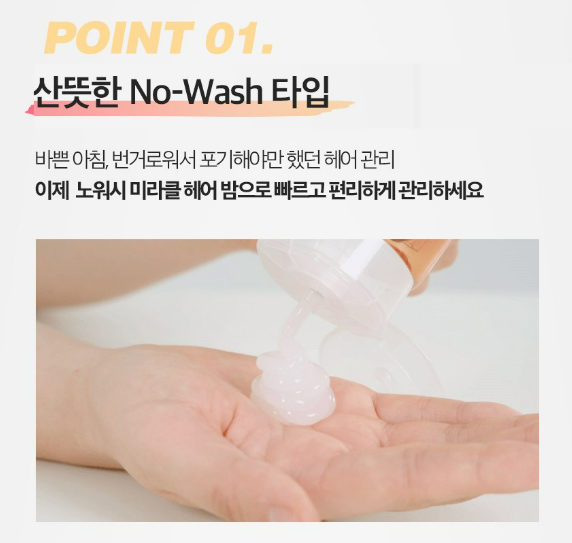 바쁜 아침 번거로워서 포기해야만 했던 헤어 관리 이제 노워시 미라클 헤어 밤으로 빠르고 편하게 관리할 수 있어요.
