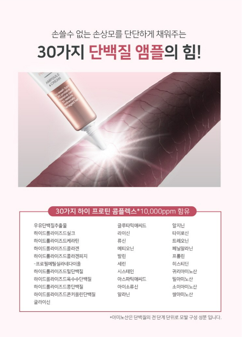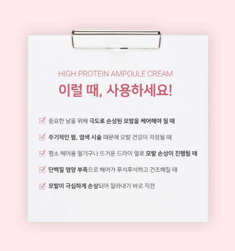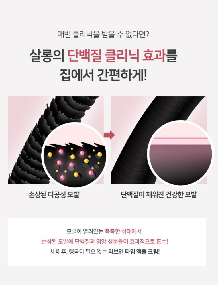 샵에서 받은 듯한 단백질 클리닉 효과를 집에서 간편하게 할 수 있어요. 모발이 열려있는 촉촉한 상태에서 손상된 모발에 단백질과 영양 성분들이 효과적으로 흡수 돼요. 사용 후 헹굼이 필요 없는 리브인 타입 앰플 크림이랍니다.