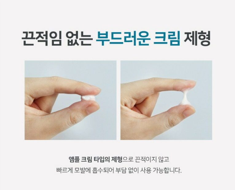 앰플 크림 타입의 제형으로 끈적이지 않고 빠르게 모발에 흡수되어 부담 없이 사용이 가능해요.