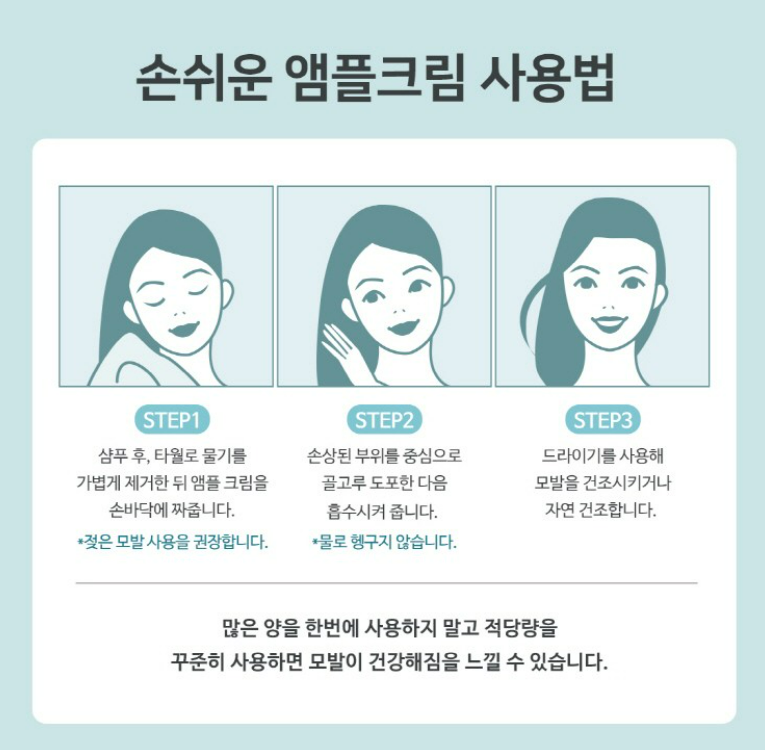 샴푸 후, 타월로 물기를 가볍게 제거한 뒤 앰플 크림을 손바닥에 짜주세요. 손상된 부위를 중심으로 골고루 도포한 다음 흡수시켜 주세요. 그 다음 드라이기를 이용해 모발을 건조시키거나 자연건조 해주세요.