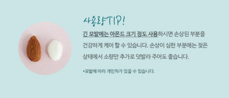 긴 모발에는 아몬드 크기 정도 사용하면 손상된 부분을 건강하게 케어할 수 있어요. 손상이 심한 부분에는 젖은 상태에서 소량만 추가로 덧발라 주세요.