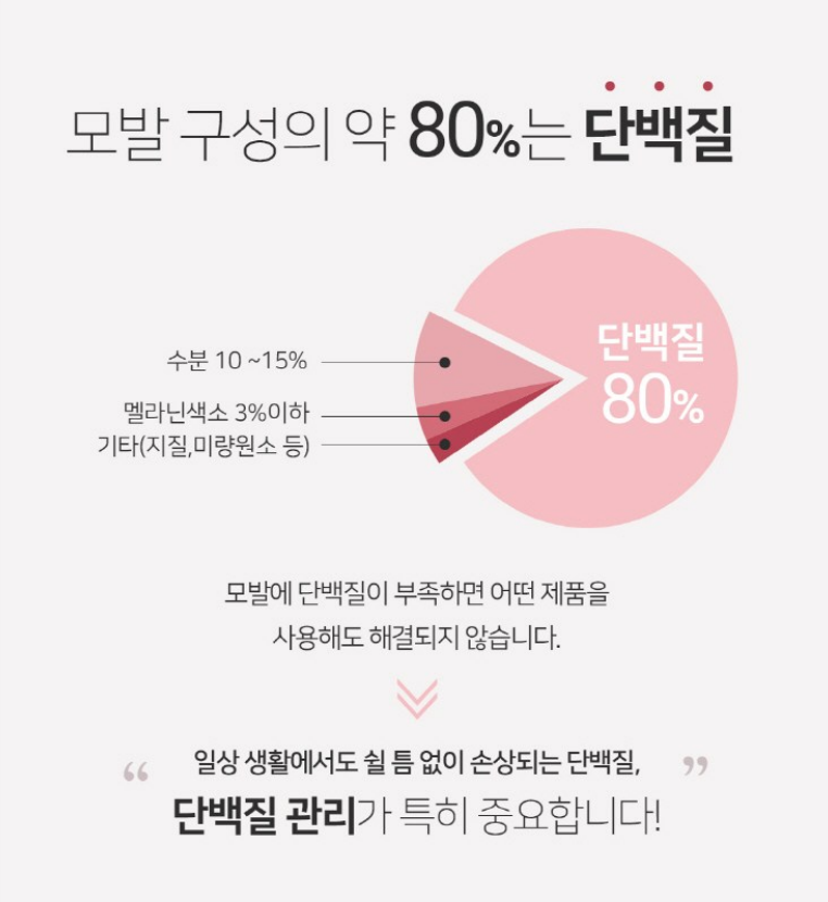 모발의 80%는 단백질이 구성하고 있는데요. 모발에 단백질이 부족하게 되면 머리가 푸석푸석해지고 건조해지고 손상되기 쉬워요.