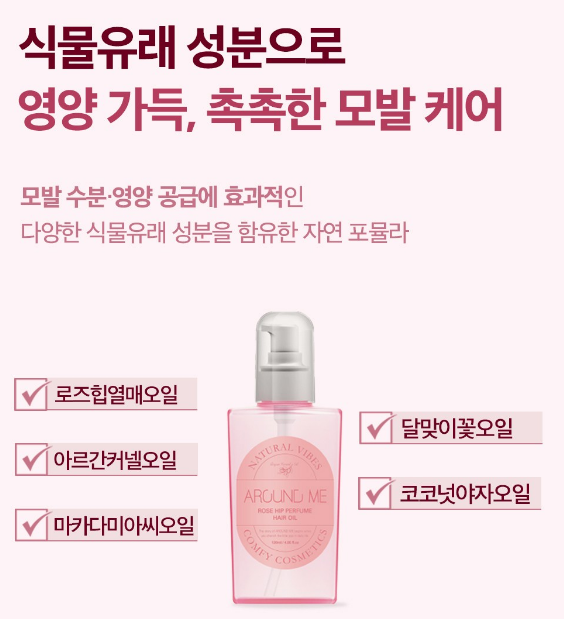 어라운드미 퍼퓸 헤어 오일은 극손상모 실크테라피가 가능하고 식물 유래 성분으로 촉촉한 모발 케어가 가능해요. 또한 끈적임없이 산뜻하고 향수 대용으로도 사용이 가능하답니다.