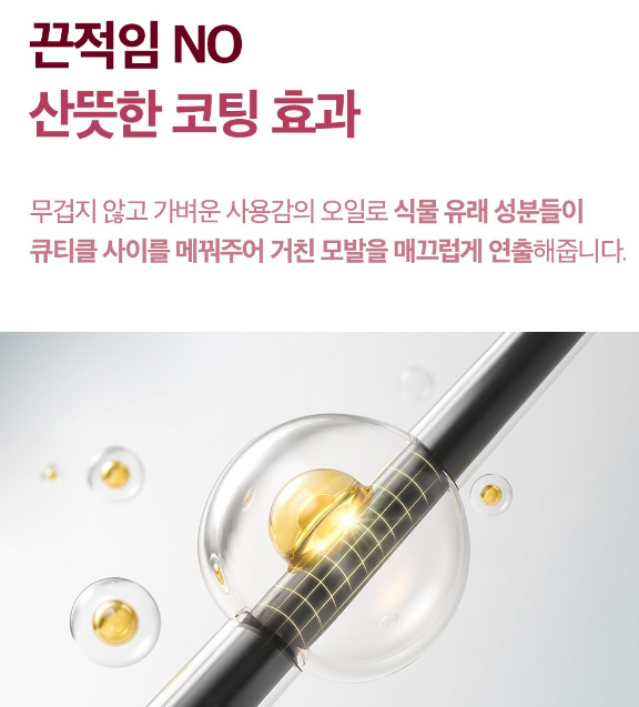 무겁지 않고 가벼운 사용감의 오일로 식물 유래 성분들이 큐티클 사이를 메꿔주어 거친 모발을 매끄럽게 연출해줘요.