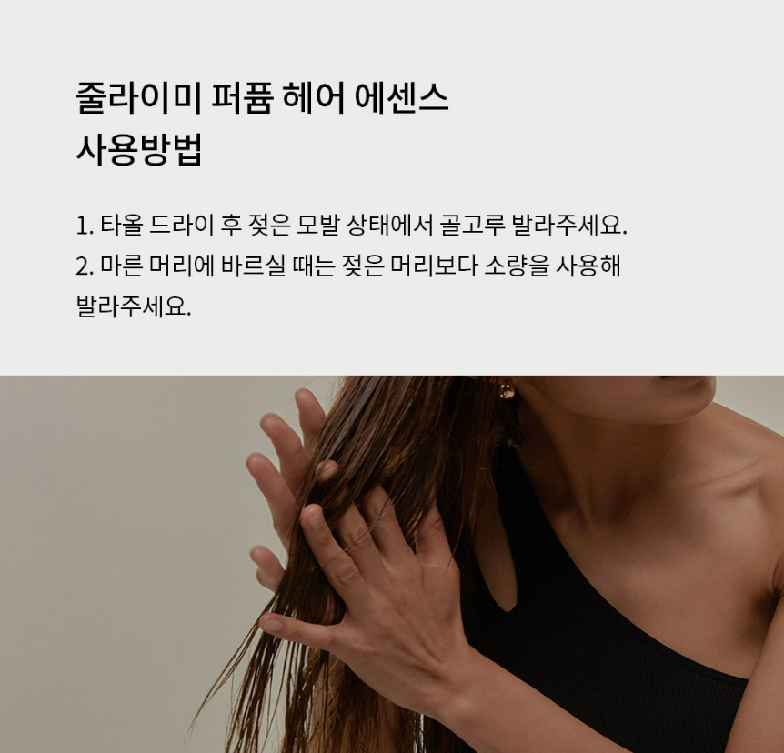 타올 드라이 후 젖은 모발 상태에 골고루 발라주세요. 그 다음 마른 머리에 바를 때는 젖은 머리보다 소량을 사용해 발라주세요.