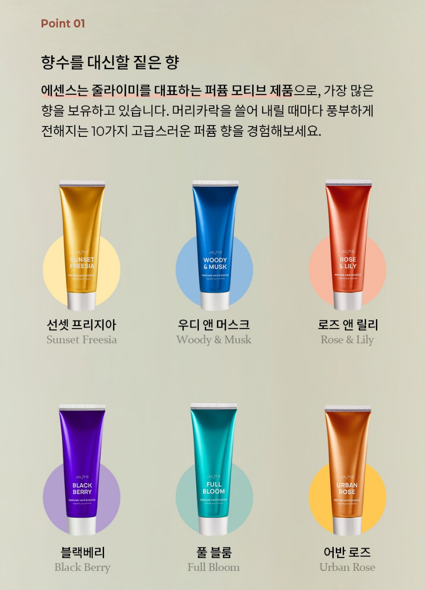 줄라이미 퍼퓸 헤어 에센스는 향수를 대신할 향, 크림 타입의 수분 에센스, 산뜻한 촉촉함, 향의 다양함, 수분 및 영양 공급이 가장 큰 5가지 특징이에요.