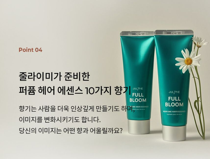 에센스는 줄라이미를 대표하는 퍼퓸 모티브 제품으로 가장 많은 향을 보유하고 있어요. 머리카락을 쓸어 내릴 때마다 풍부하게 전해지는 10가지 고급스러운 퍼퓸 향을 경험할 수 있어요.