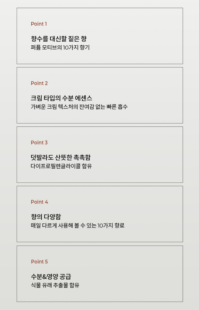 에센스 향의 선택지가 다양해서 좋고, 향이 오래도록 지속되어 향수 대신 사용하기에도 좋아요.