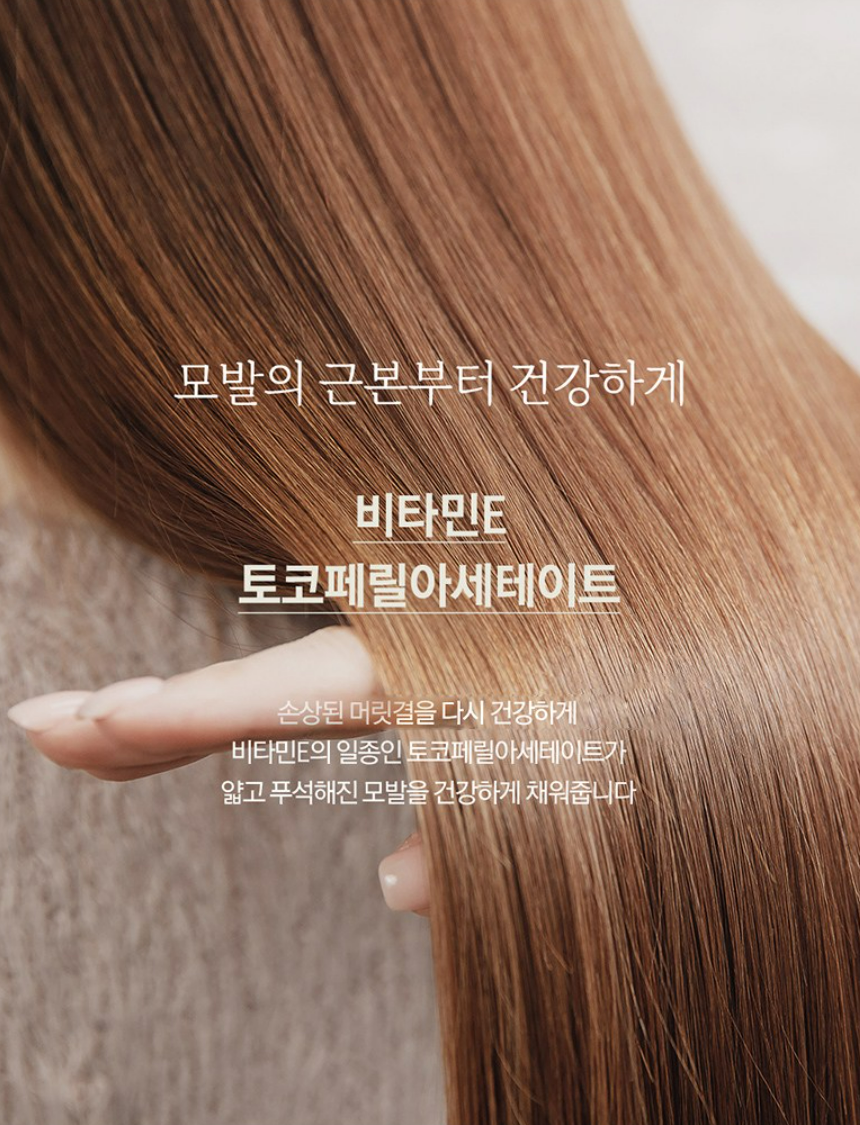 손상된 머릿결을 다시 건강하게 비타민 E의 일종인 토코페릴아세테이트가 얇고 푸석해진 모발을 건강하게 채워줘요.