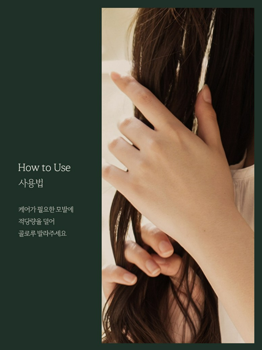 젖은 모발에 바르고 머리를 말린 다음, 마른 모발의 상태에서 모발 끝에 살짝만 더 발라주세요. 푸석푸석한 머리결을 매끄럽게 만들 수 있어요.