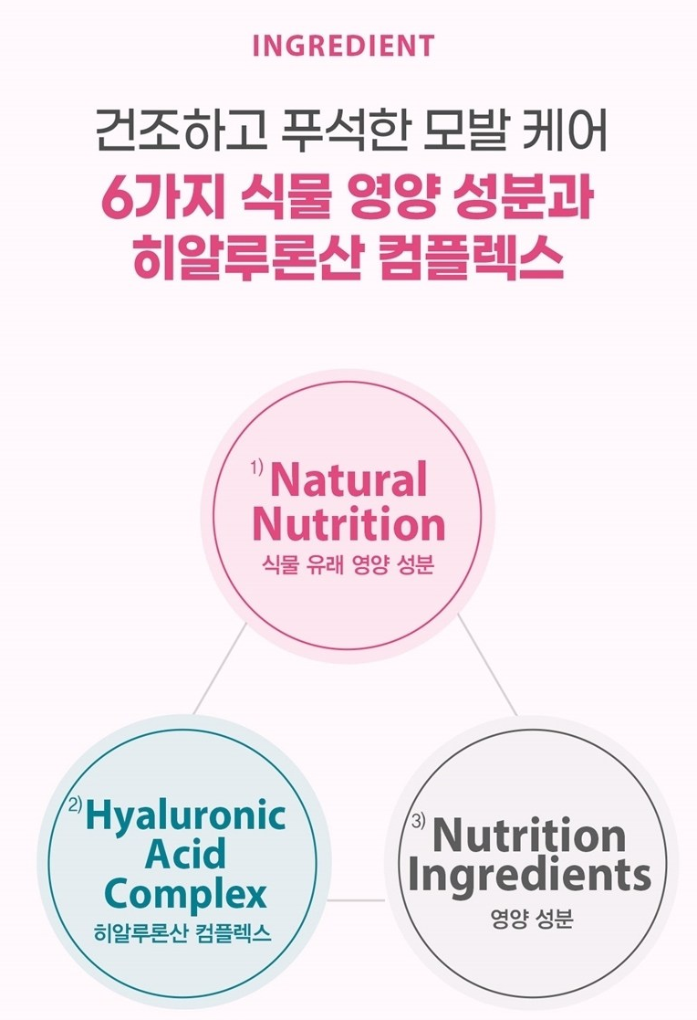 6가지 식물 영양 성분과 히알루론산 컴플렉스 함유로 모발에 영양을 공급해주고 윤기 코팅 2중 보습 케어가 가능해요.