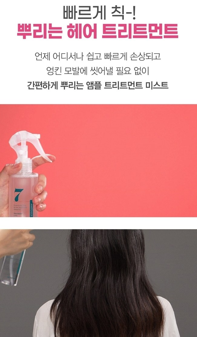 언제 어디서나 쉽고 빠르게 손상되고 엉킨 모발에 씻어낼 필요 없이 간편하게 뿌리는 형태의 앰플 트리트먼트 미스트예요.