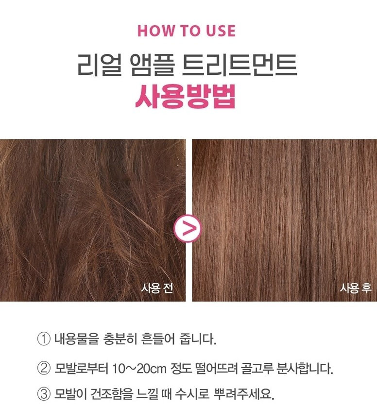 내용물을 충분히 흔들어 준 후 모발로부터 10~20cm 정도 떨어뜨려 골고루 분사해주세요. 모발이 건조할 때 수시로 뿌려주셔도 좋아요.