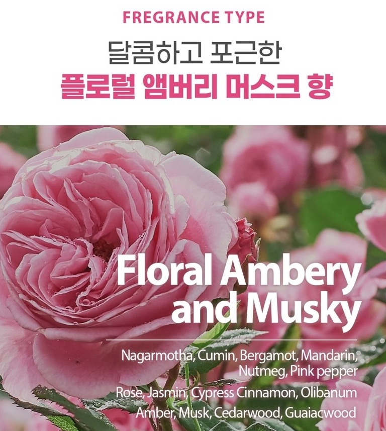 플로럴 향과 머스크 향의 적절한 조화로 부담없이 사용하기 좋아요.