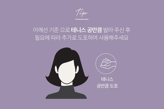 어깨선 기준으로 테니스 공 만큼 발라주신 후 필요에 따라 추가로 도포하여 사용해주세요.