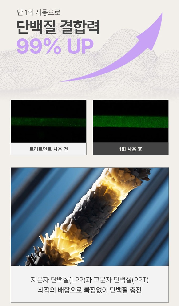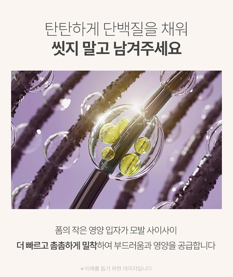 저분자 단백질과 고분자 단백질 최적의 배합으로 빠짐 없이 모발에 단백질을 충전해줘요.