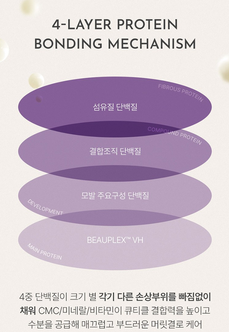 4중 단백질이 크기 별 각기 다른 손상부위를 빠짐 없이 채워 CMC/미네랄/비타민이 큐티클 결합력을 높이고 수분을 공급해 매끄럽고 부드러운 머릿결로 케어해줘요.