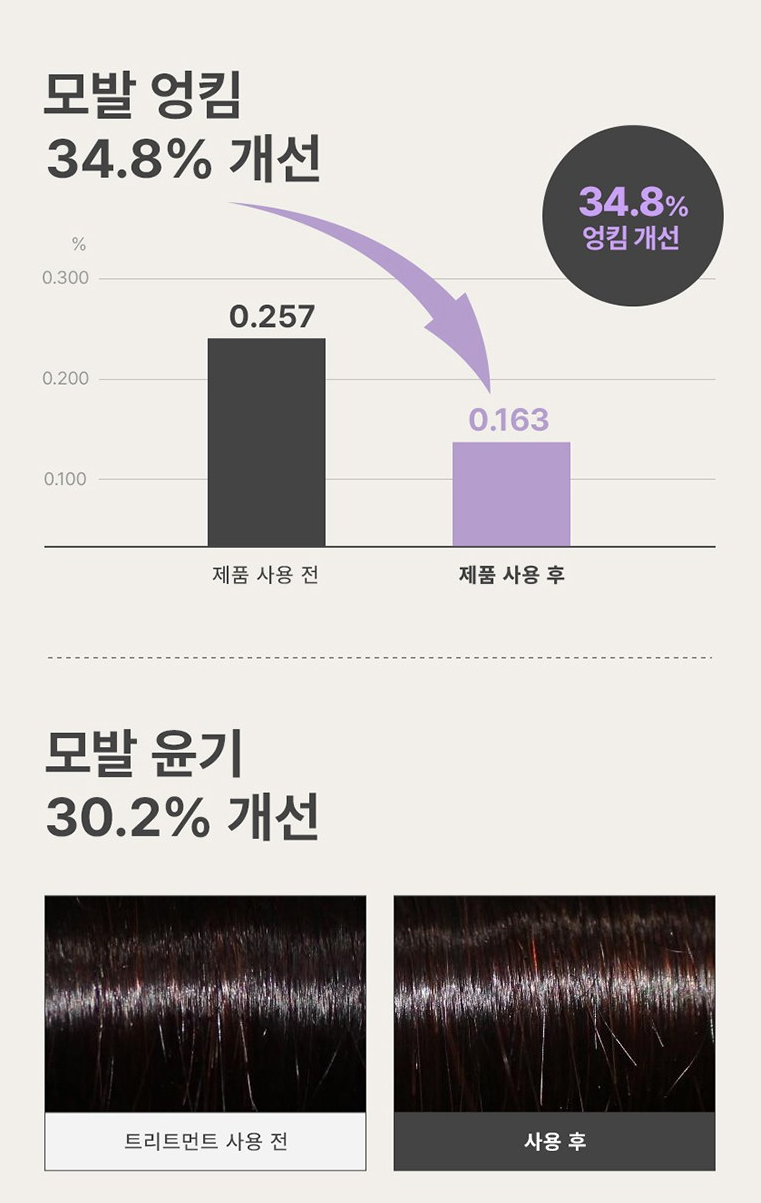 뿐만 아니라 모발 엉킴과 윤기까지 개선되었어요.