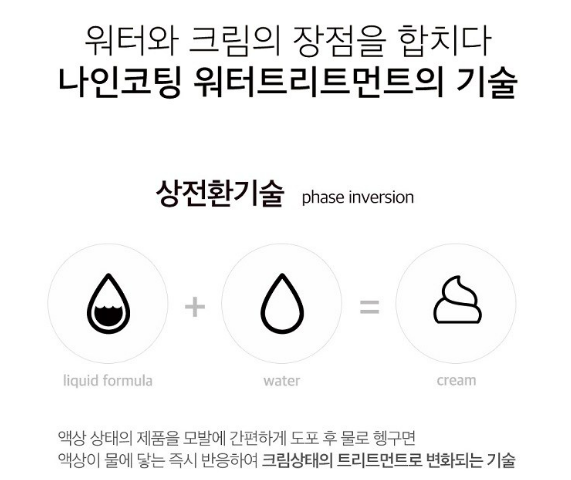 나인코팅 워터 트리트먼트는 액상 상태의 제품을 모발에 간편하게 도포 후 물로 헹구면 액상이 물에 닿는 즉시 반응하여 크림 상태의 트리트먼트로 변화되는 상전환 기술을 활용했어요.