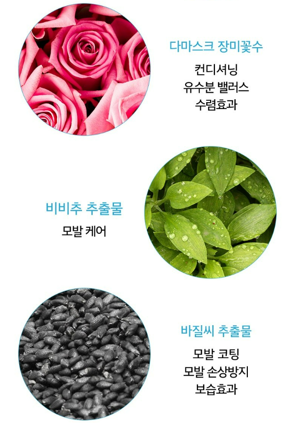 PMB, 블랙푸드, 다마스크 장미꽃수, 비비추 추출물, 바질씨 추출물이 함유되어 모발 보습 및 모발 케어에 효과적이에요.