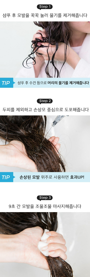 샴푸 후 수건 등으로 머리의 물기를 제거해주세요. 그 다음 손상된 모발 위주로 트리트먼트를 도포해주세요. 9초간 모발을 조물조물 마사지해주세요.