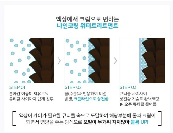 나인코팅 워터 트리트먼트 액상이 케어가 필요한 큐티클 속으로 도달하여 해당 부분에 물과 크림이 되면서 영양을 주는 방식으로 모발이 무거워지지 않아 모발 영양 뿐만 아니라 모발 볼륨까지 챙길 수 있어요.