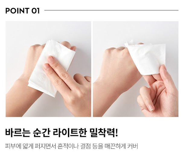 피부에 얇게 퍼지면서 흔적이나 결점 등을 매끈하게 커버해주는 라이트한 밀착력이 장점이에요!