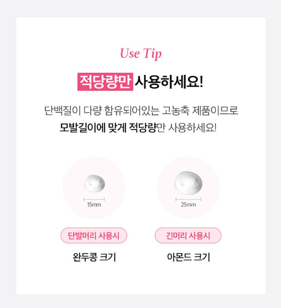 단백질이 다량 함유되어 있는 고농축 제품이므로 모발 길이에 맞게 적당량 사용하시는 것이 좋은데요. 단발머리는 완두콩 크기, 긴머리는 아몬드 크기정도로 사용해주세요.