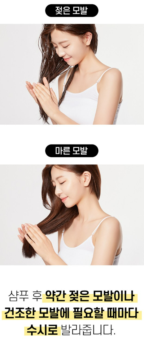 마른 모발에 사용할 경우 젖은 모발보다 흡수력이 살짝 느릴 수 있어요. 그래서 충분한 시간을 두고 모발에 흡수시켜 주세요.
