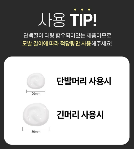 단백질이 다량 함유되어 있는 제품이므로 모발 길이에 따라 적당량만 사용하는 것이 중요해요. 단발머리 사용시 20mm, 긴머리는 30mm 정도 사용해주세요.