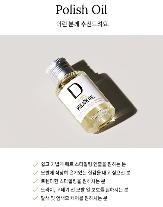 쉽고 가볍게 웨트 스타일링 연출을 원하는 분, 모발에 적당이 윤기 있는 질감을 내고 싶은 분, 트렌디한 스타일링을 원하시는 분, 드라이, 고데기 전 모발 열 보호를 원하시는 분, 탈색 및 염색모 케어를 원하시는 분들께 다슈 폴리쉬 오일을 추천드려요.