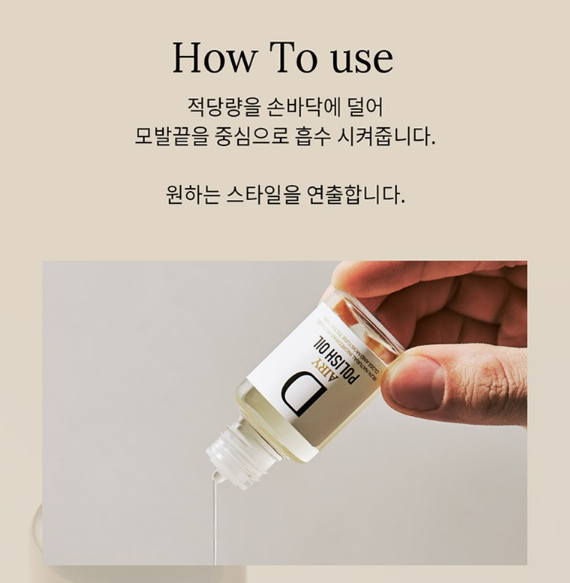 적당량을 손바닥에 덜어 모발 끝을 중심으로 흡수 시켜주세요. 그 다음 원하는 스타일을 연출해주세요.