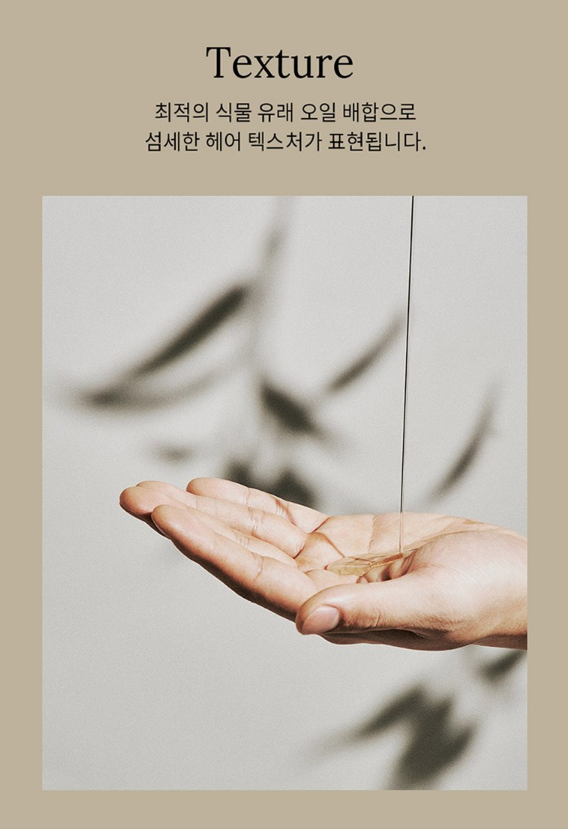 최적의 식물 유래 오일 배합으로 섬세한 헤어 텍스처를 표현할 수 있어요.