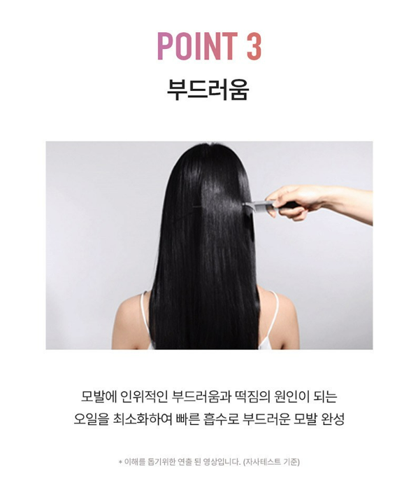 모발에 인위적인 부드러움과 떡짐의 원인이 되는 오일을 최소화하여 빠른 흡수로 부드러운 모발을 완성해줘요.