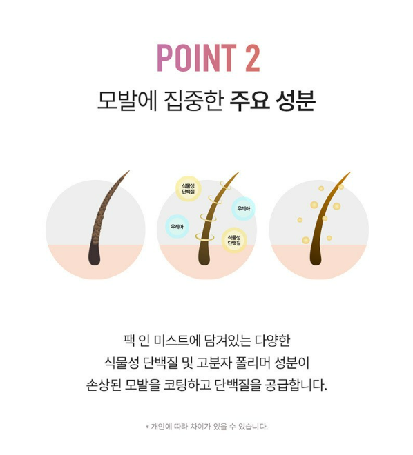 팩 인 미스트에 담겨있는 다양한 식물성 단백질 및 고분자 폴리머 성분이 손상된 모발을 코팅하고 단백질을 공급해줘요.