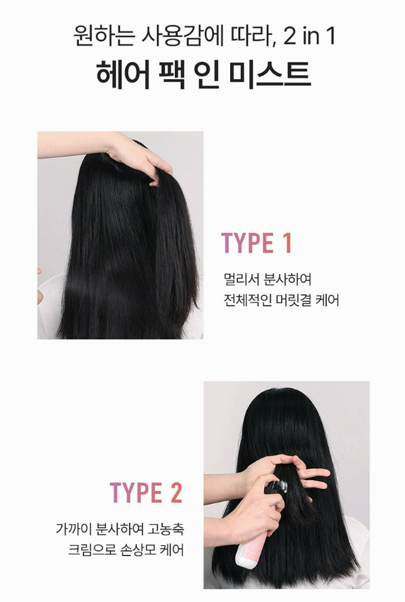 멀리서 분사하여 미스트 형태로 전체적인 머릿결 케어도 가능하고, 가까이 분사하여 고농축 크림으로 손상모 케어도 가능해요.