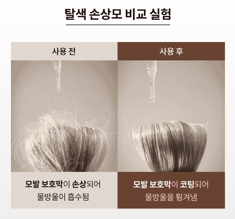 미쟝센 앰플 트리트먼트 사용 전에는 모발 보호막이 손상되어 물방울이 흡수되는 것을 볼 수 있었는데, 사용 후에는 모발 보호막이 코팅되어 물방울을 튕겨내는 것을 확인할 수 있어요.