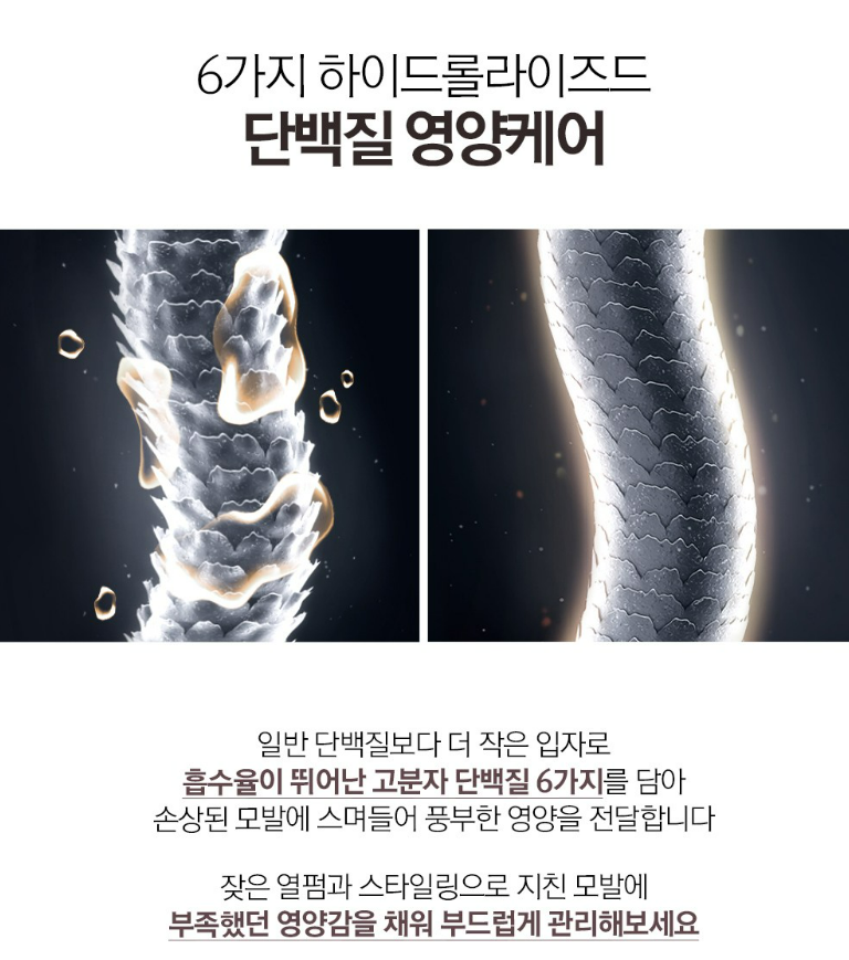 일반 단백질보다 더 작은 입자로 흡수율이 뛰어난 고분자 단백질 6가지를 담아 손상된 모발에 스며들어 풍부한 영양을 전달해요. 잦은 열펌과 스타일링으로 지친 모발에 부족했던 영양감을 채워 부드럽게 관리할 수 있어요.