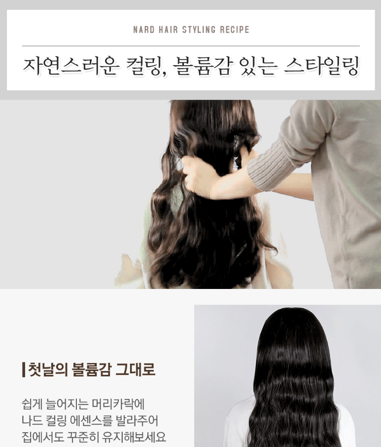 나드 컬링 에센스는 쉽게 늘어지는 머리카락에 자연스러운 컬링과 볼륨을 주고 유지할 수 있어요.